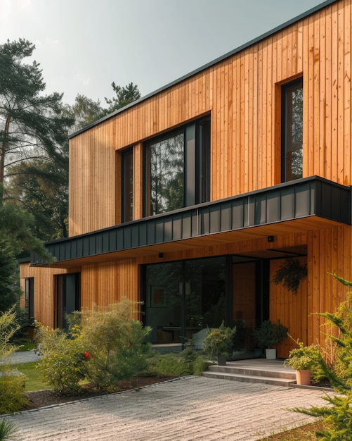 Дизайн дома отличается современным стилем, сочетающим в себе функциональность и эстетику. Большие окна обеспечивают отличное естественное освещение во всех помещениях.